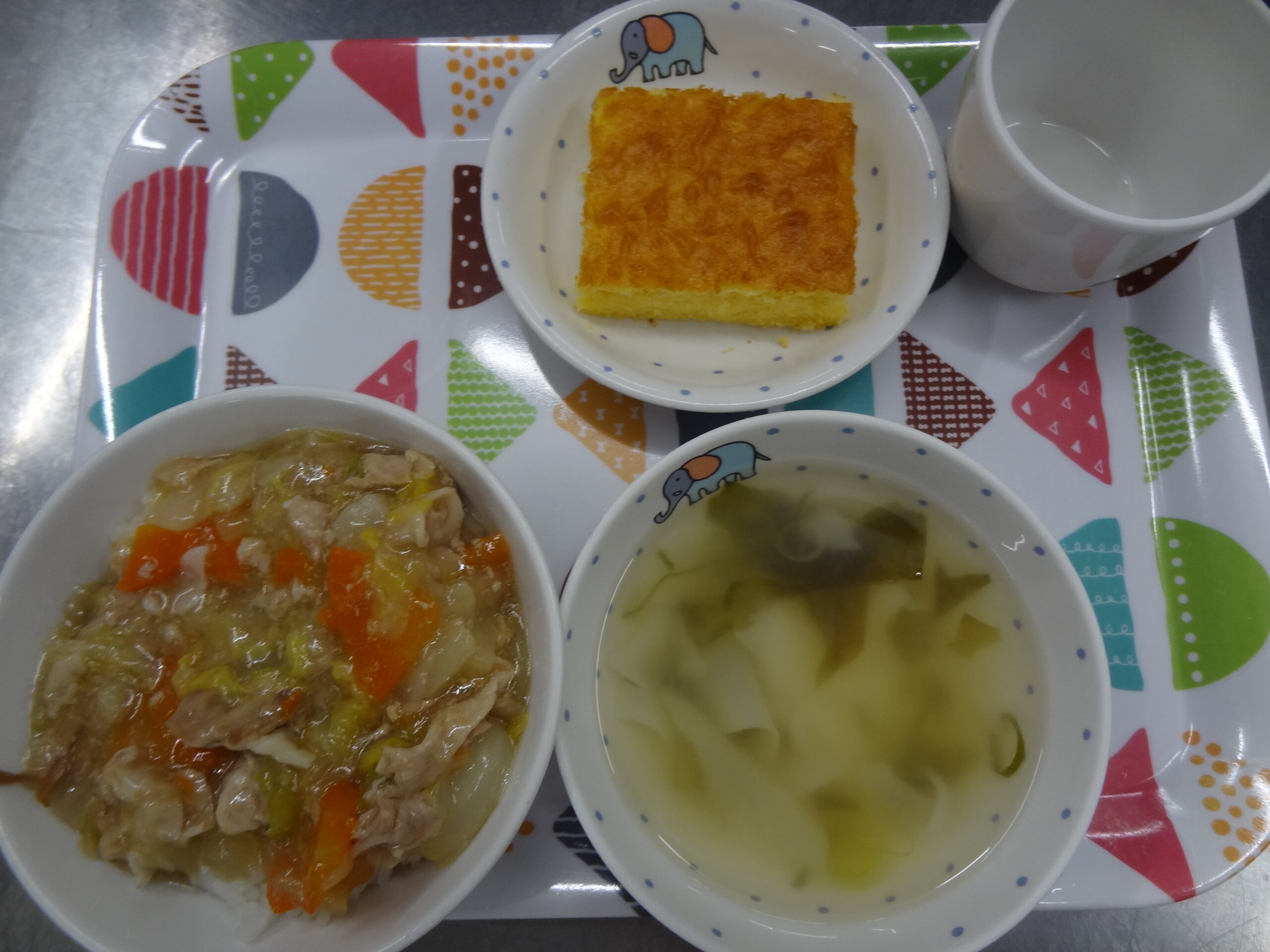 今日の給食は 中華丼 ワンタンスープ です。