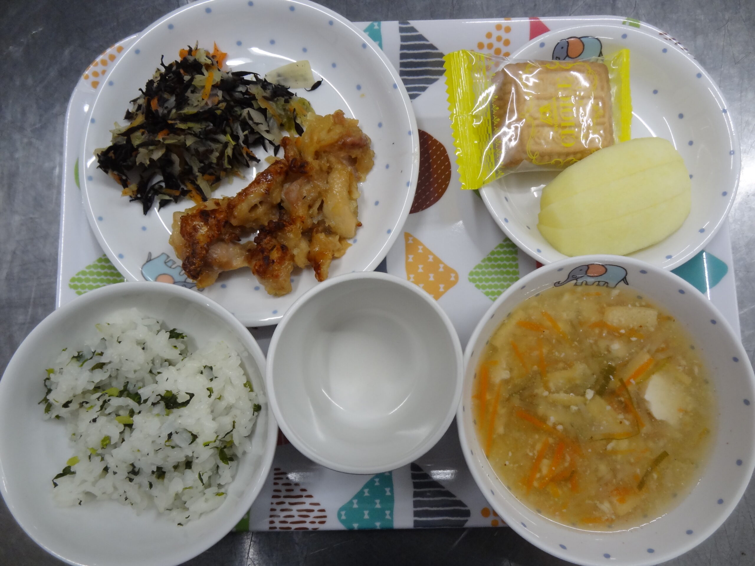 今日の給食は 菜飯 鶏の唐揚げ キャベツとひじきのサラダ けんちん汁 です。