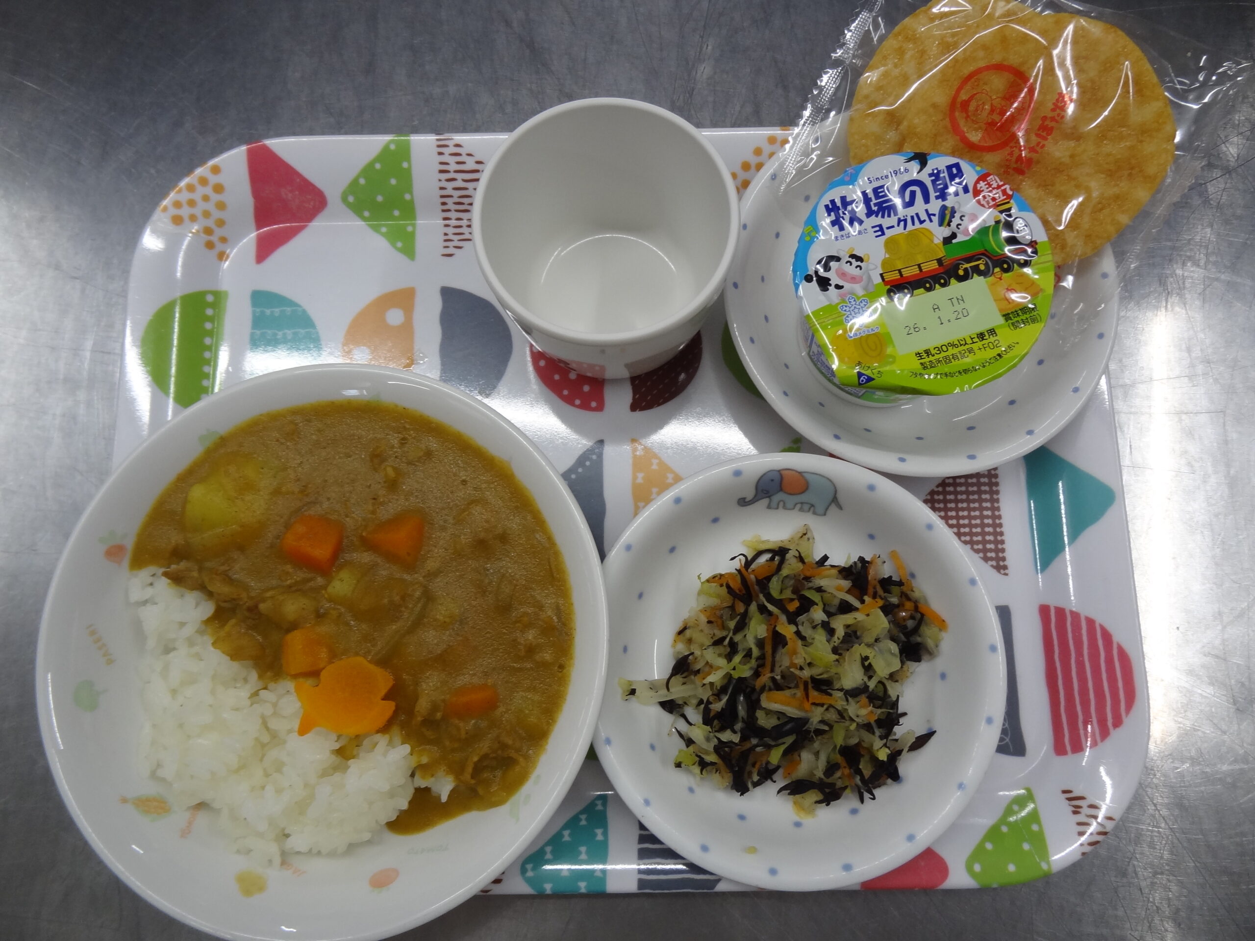 今日の給食はカレーライス キャベツとひじきのサラダです。