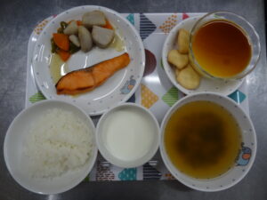 今日の給食は 御飯 鮭のゆうあん焼き 里芋の煮付け 清汁 です。