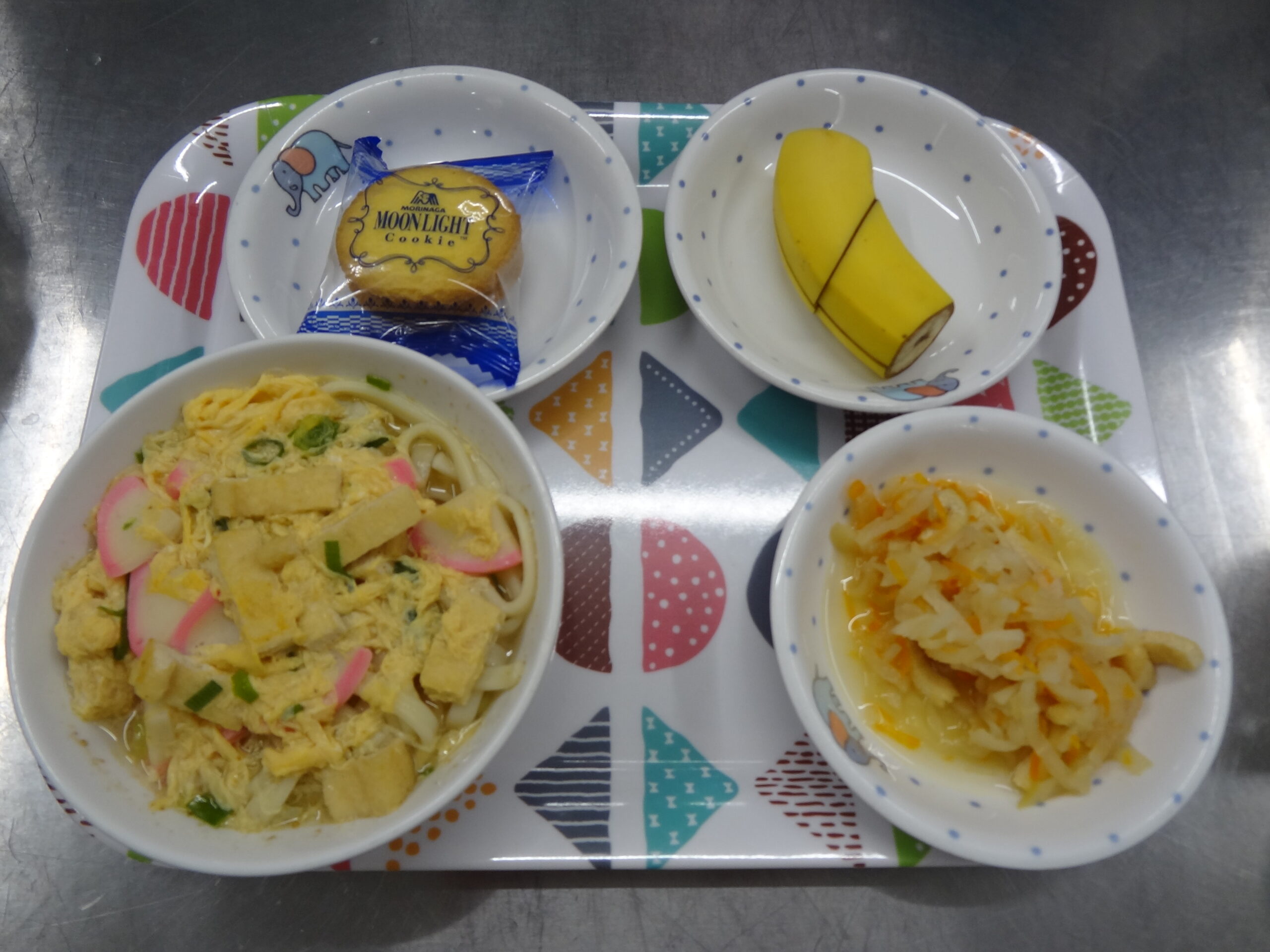 今日の給食は 衣笠うどん 切干大根の煮物 バナナ です。