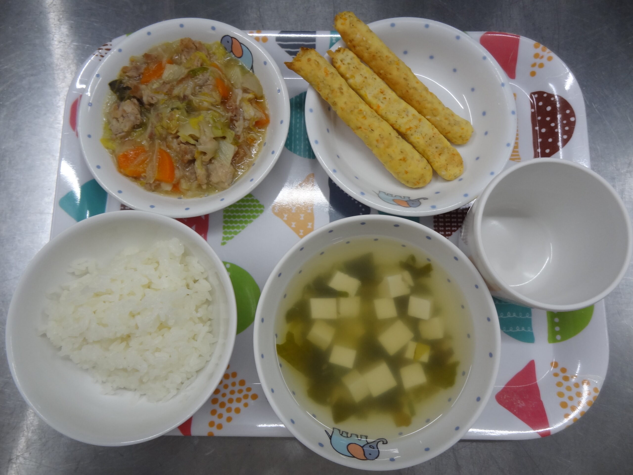 今日の給食は 御飯 八宝菜 ワカメスープ