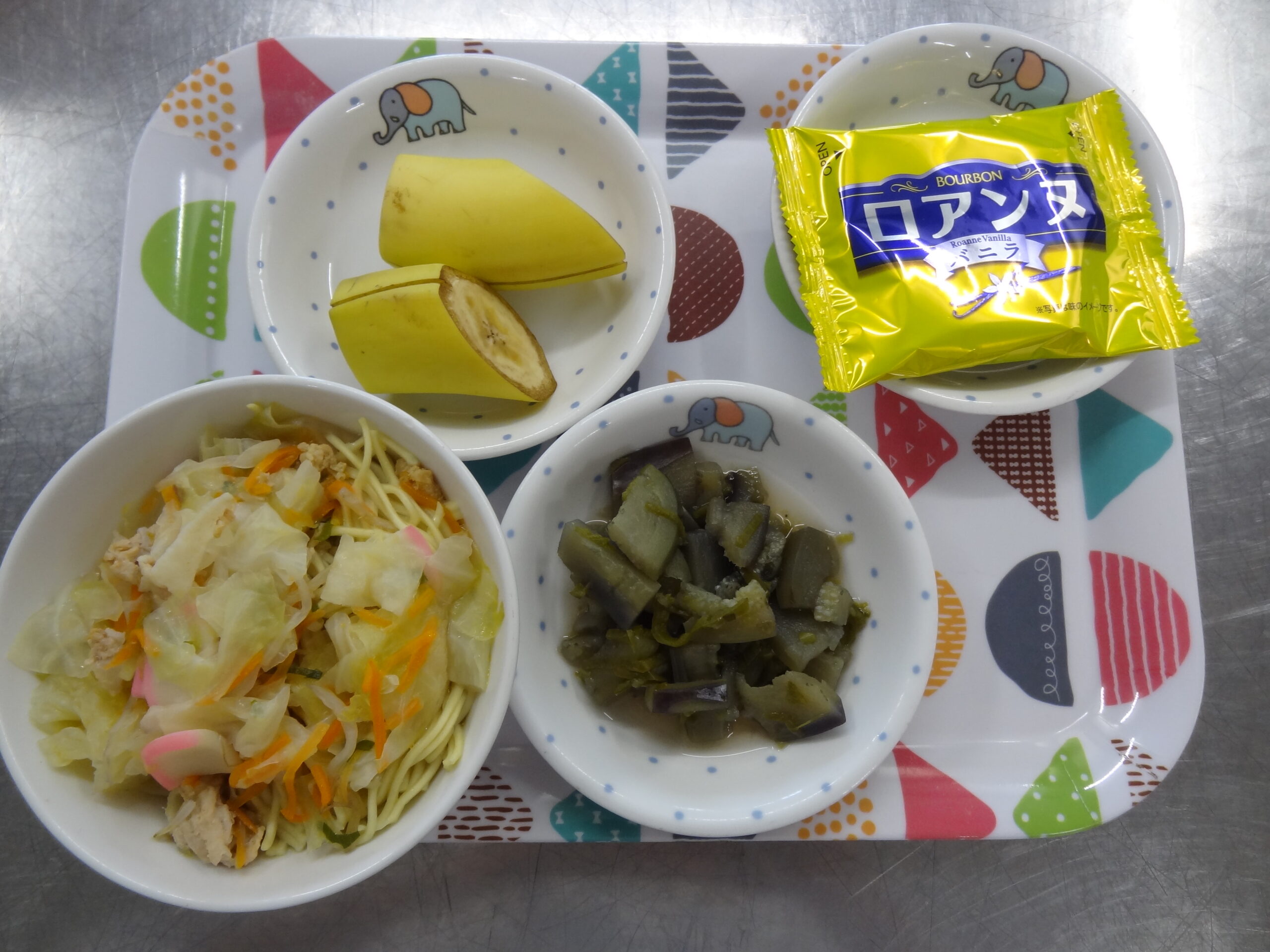今日の給食は野菜たっぷりラーメン 茄子の煮浸し バナナです。