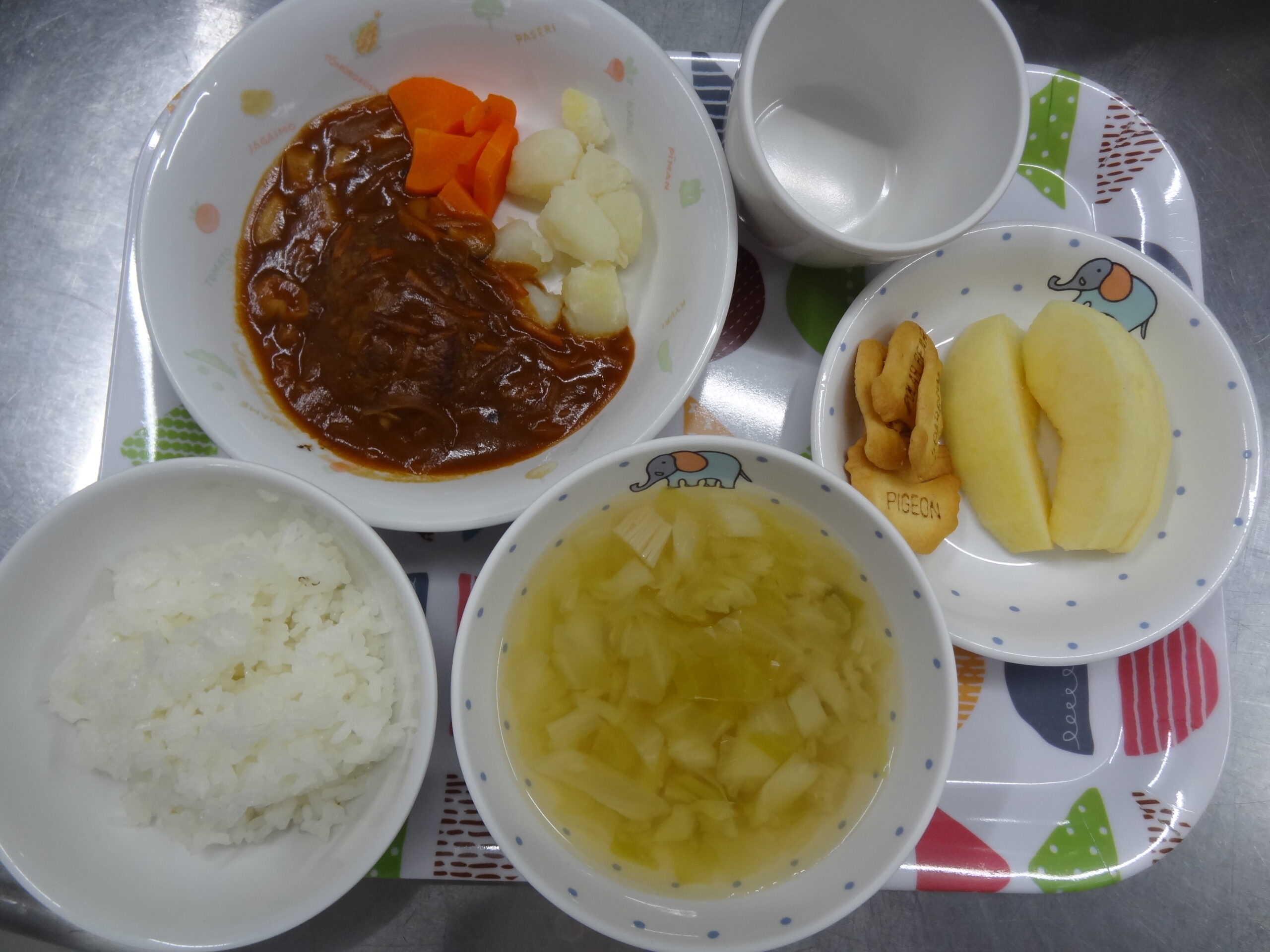 今日の給食は御飯 煮込みハンバーグ温野菜添え キャベツとえのきのスープです。