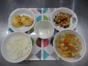 今日の給食は御飯 白菜と豚肉の煮物 五目豆です。