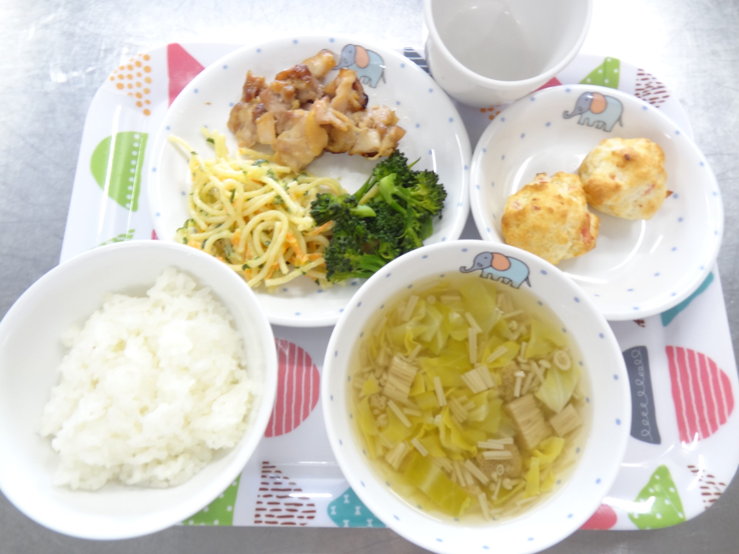 今日の給食は御飯 照り焼きチキン スパゲティーサラダ えのきのスープです。