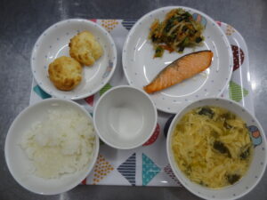 今日の給食は御飯 鮭のゆうあん焼き 三色お浸し かきたま汁です。