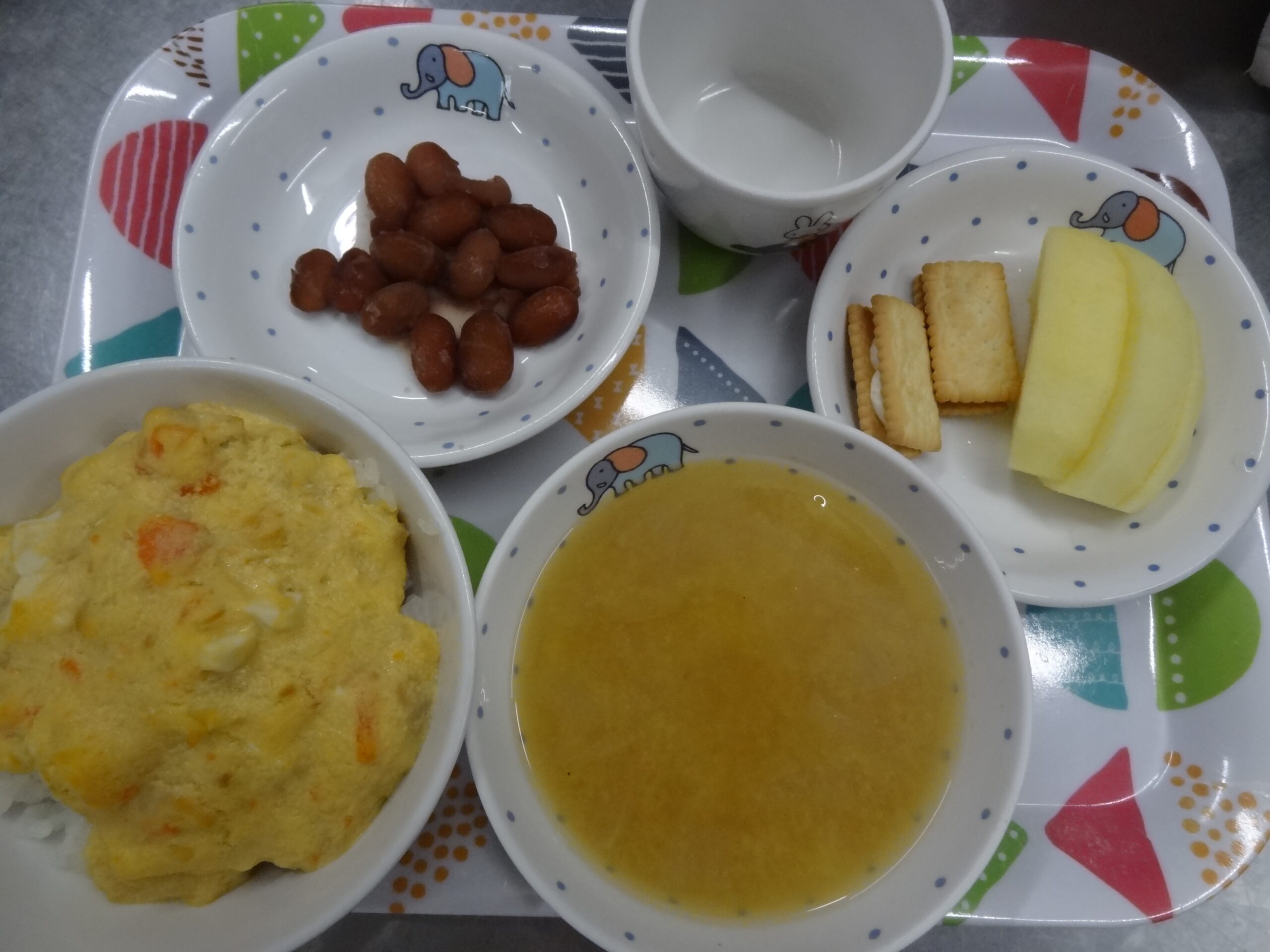 12月5日の給食 今日の給食はカレーライス キャベツとりんごのサラダです。 今日は園長先生の知り合いの方からじゃが芋をいただいたので、それを使ってきく組さんはクッキングをしました みんなとっても上手にピーラーや包丁を使って調理してくれていました! おやつはヨーグルト お菓子 牛乳です。